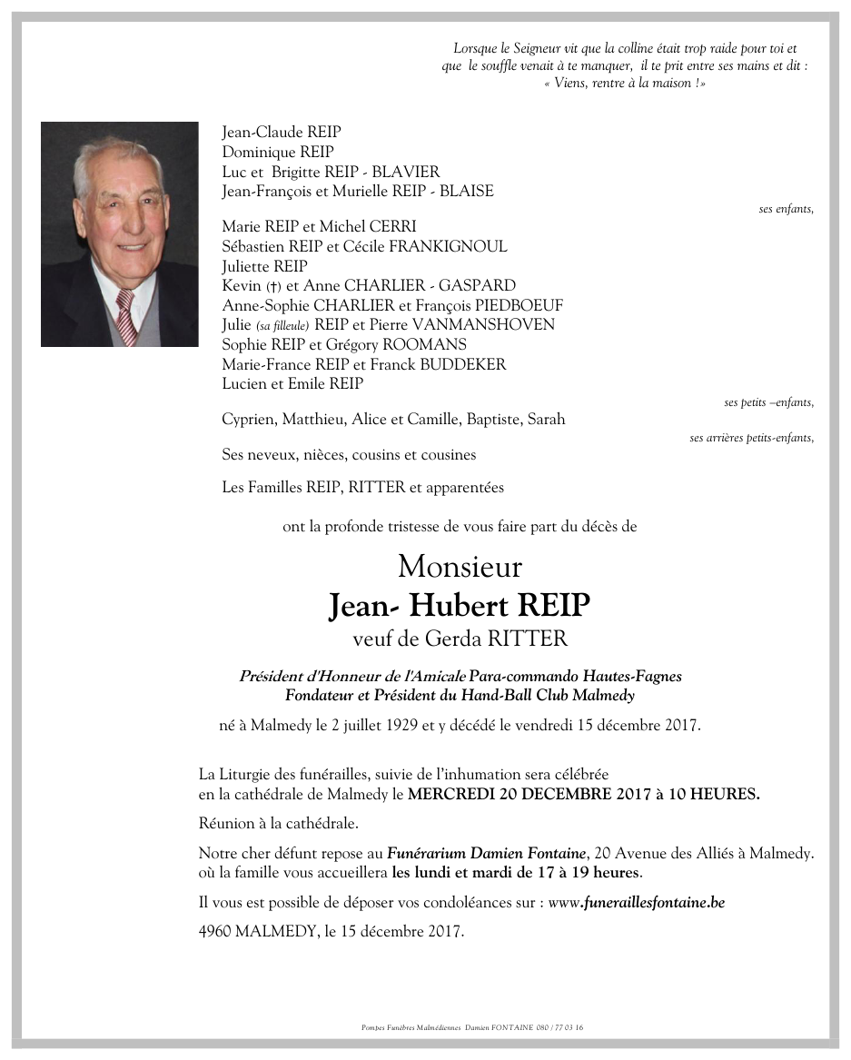 Décédé à Malmedy (4960) le vendredi 15 décembre 2017 à l'âge de 88 ans