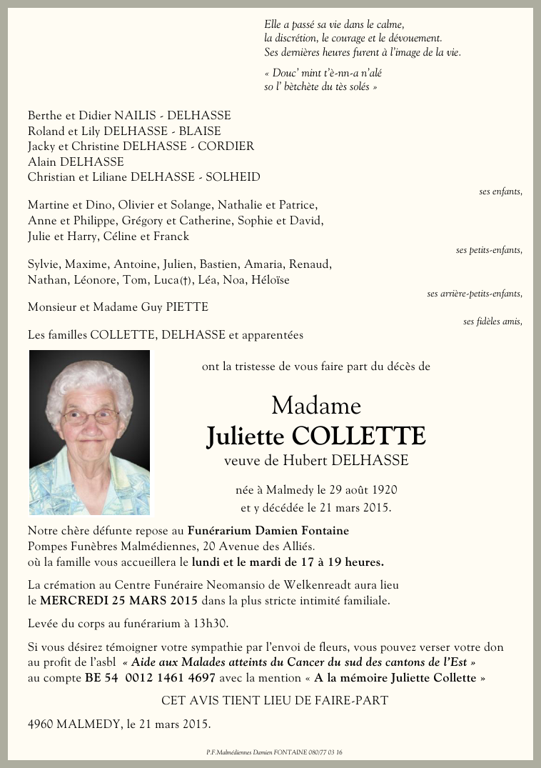 Madame Juliette COLLETTE veuve de Hubert DELHASSE