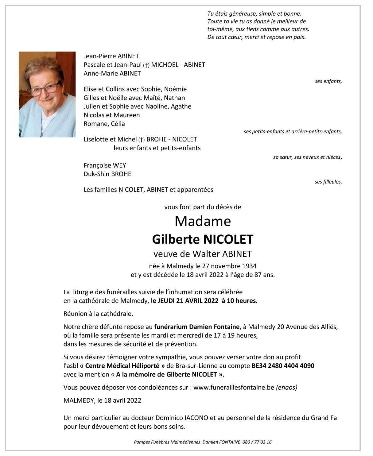 Madame Gilberte NICOLET veuve de Walter ABINET