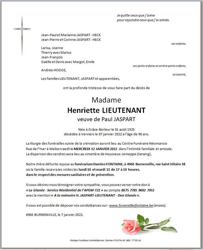 Madame Henriette JASPART née LIEUTENANT