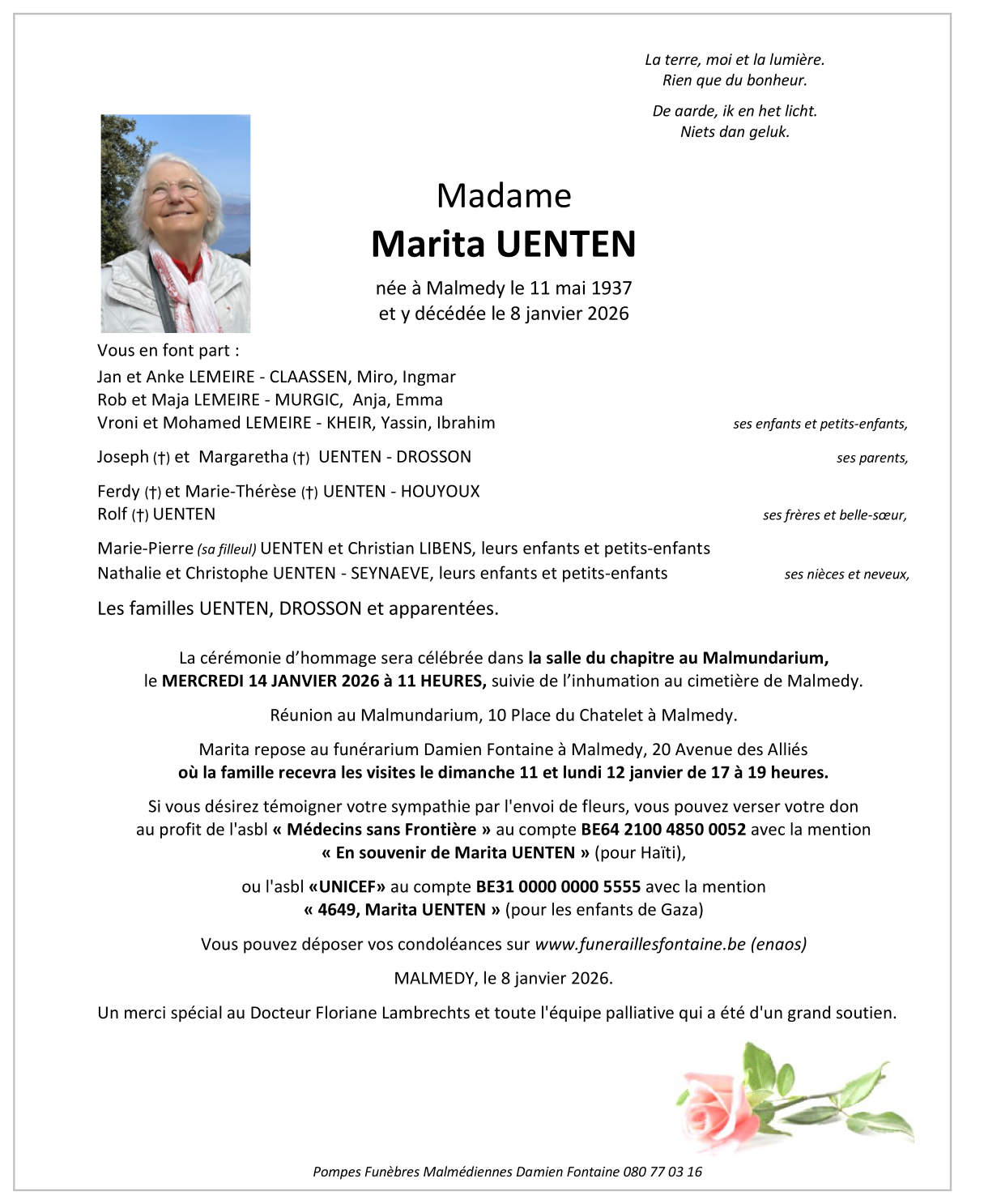 Décédée à Malmedy (4960) le jeudi 8 janvier 2026 à l'âge de 88 ans
